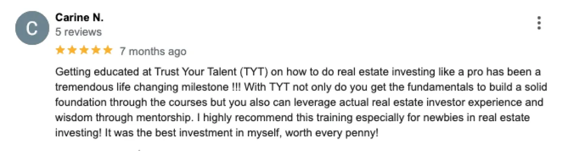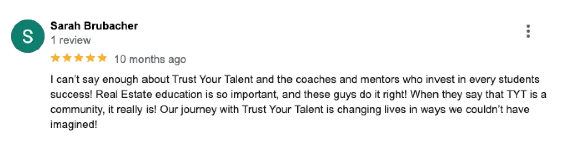 You’ll discover why the real estate investing mentorship we offer at Trust Your Talent is unlike anything you've seen or heard before.