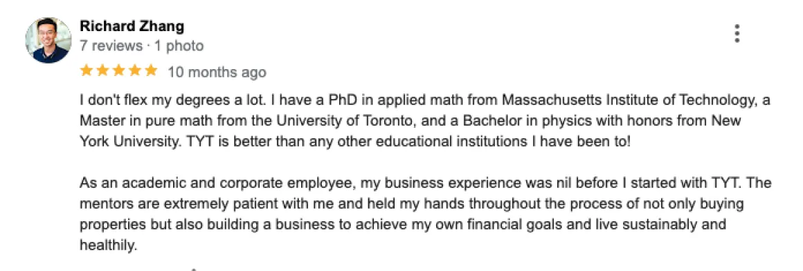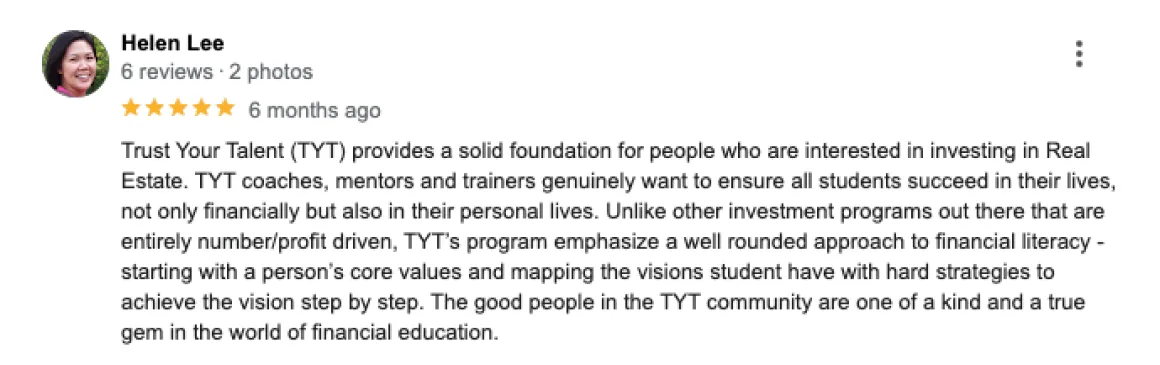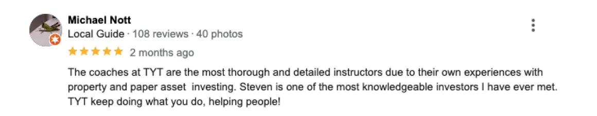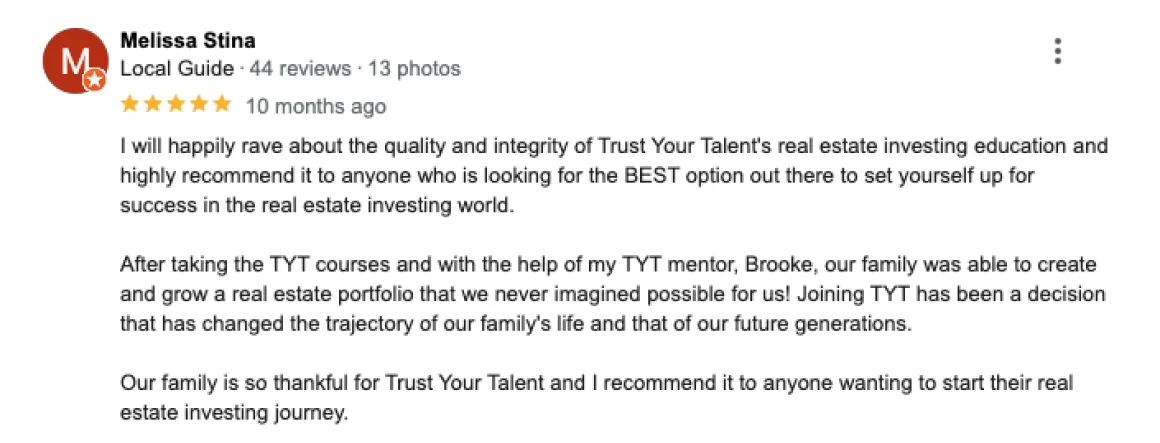 Or Michelle, who closed 8 investment deals within 12 months of starting her real estate investment journey with Trust Your Talent's education.